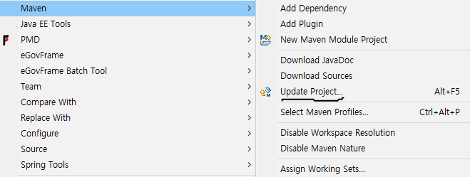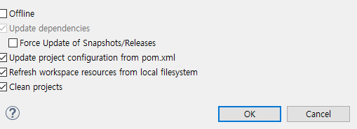 이어서 뜨는 창의 밑에 3개(pom.xml 설정 , 프로젝트 리프레시, 프로젝트 클린)