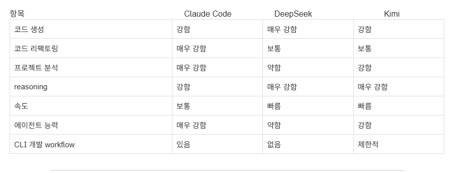 항목 Claude Code DeepSeek Kimi