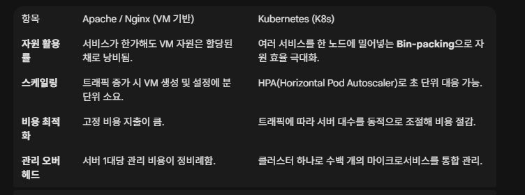 | 비교 포인트 | Apache/Nginx (VM) | Kubernetes (K8s) |