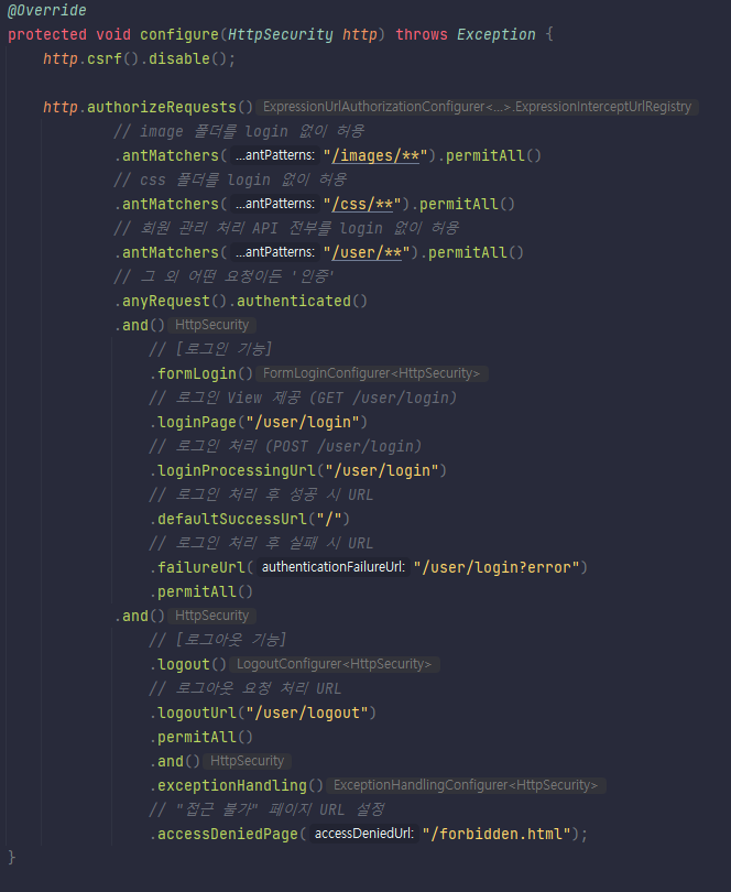 authorizeRequests()를 통해서 통신 권한을 인가 설정할수 있다.