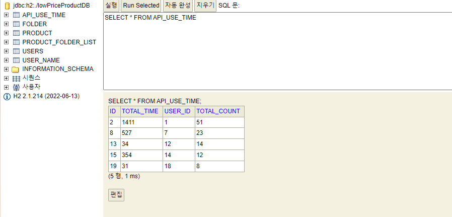 유저별 API 조회시간 테이블이다.(관리자만 접근 가능한 API..)