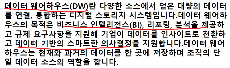 데이터 웨어하우스(DW)는 다양한 소스로부터 대량의 데이터를 연결해 BI, 리포팅, 분석을 제공하는 디지털 스토리지 시스템입니다.