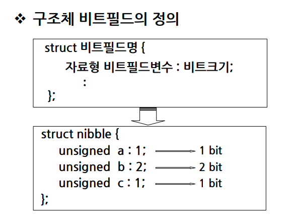 - 구조체 비트필드 : 주기억장치의 기억공간을 byte 단위가 아닌 bit 단위로 사용하는 방법