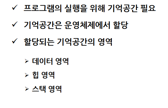 - 힙(heap)영역 : 프로그래머의 필요에 의해 할당과 소멸이 이루어지는 기억공간영역