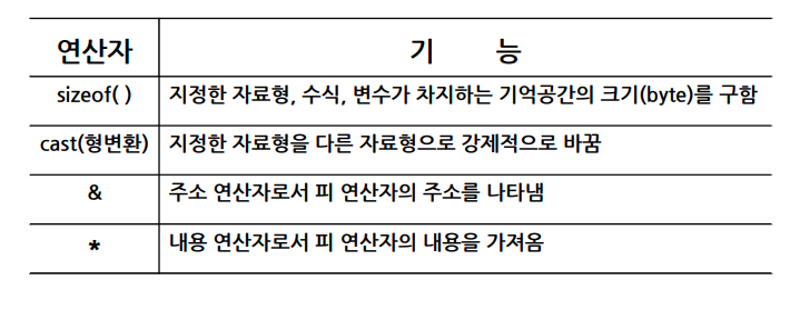 - 기타 연산자 : sizeof( ), cast(형변환), &(주소 연산자), *(내용 연산자) 등
