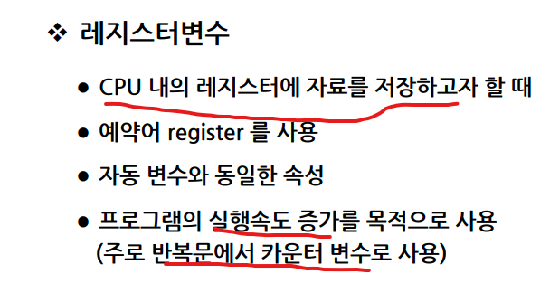 - 레지스터 변수 : CPU 내의 레지스터에 자료를 저장하고자 할 때 사용되는 유형