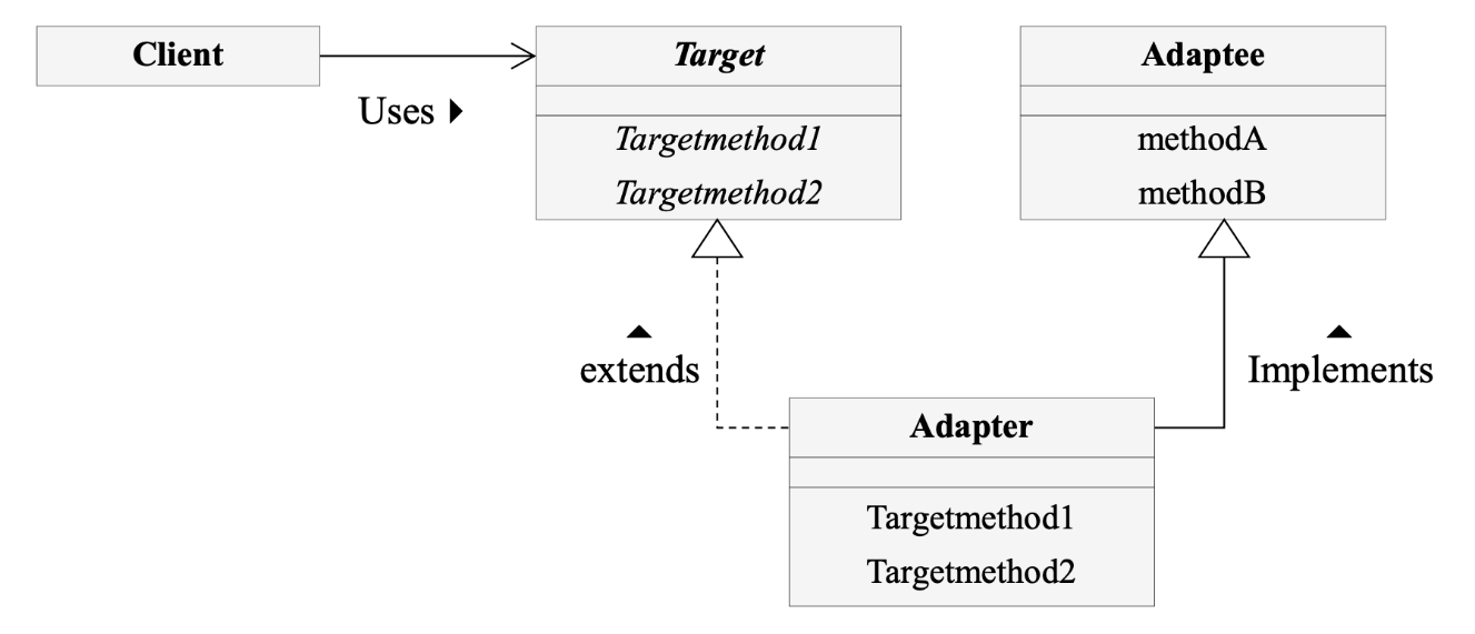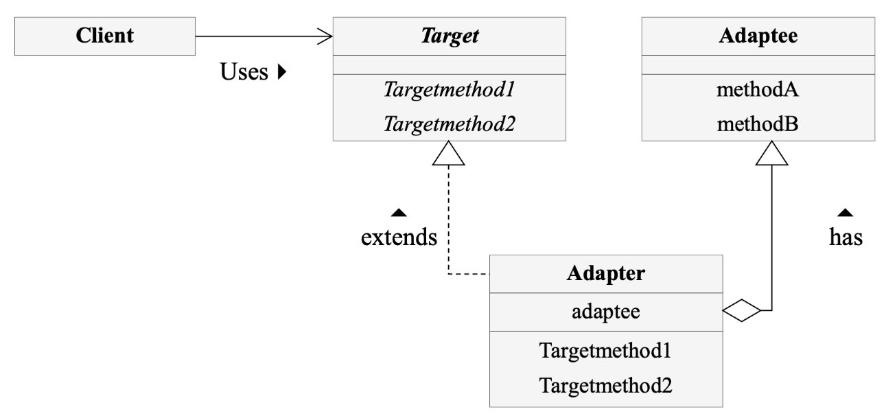 - Adapter : Target 인터페이스에 Adaptee의 인터페이스를 맞춰주는 클래스