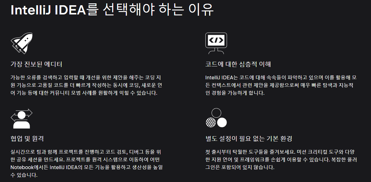 인텔리제이는 2001년 출시부터 편리한 코드 컴플리션 및 리팩토링 기능을 지원하였고 2009년에 무료 커뮤니티 에디션이 나오면서 많은 자바 개발자를 양산했다고 한다... 흠 현시점에서 14년 전이다.