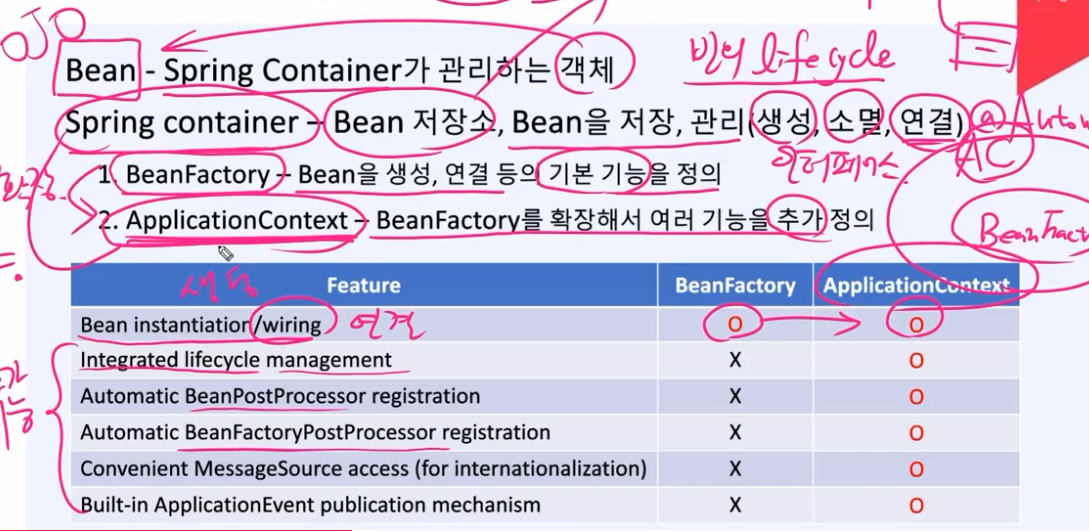 하기 그림의 Spring Container는 ApplicationContext라고 보면 되며 Bean 생성 등 BeanFactory를 확장해서 여러기능을 추가 정의