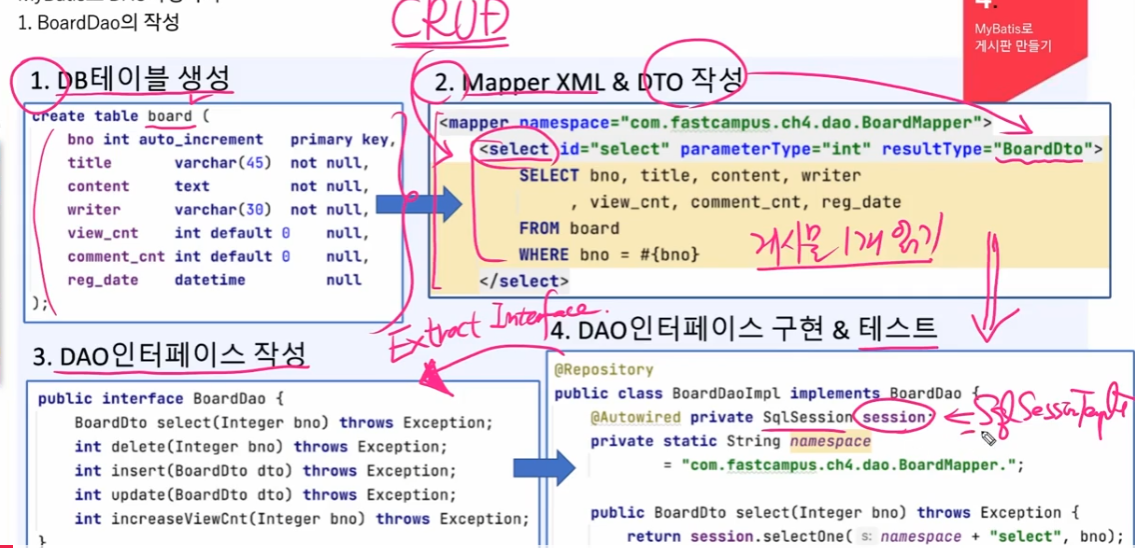 테이블 생성 -> mapper & dto 생성 -> dao인터페이스 -> dao인터페이스구현 &테스트