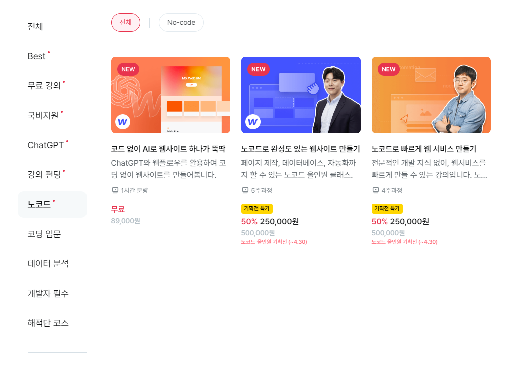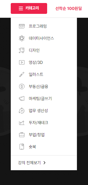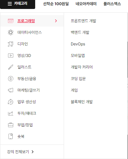 강의 카테고리를 보면 프로그래밍은 프론트, 백엔드, 데브옵스, 모바일, 게임 ,블록체인 등으로 세분화 되어 있고