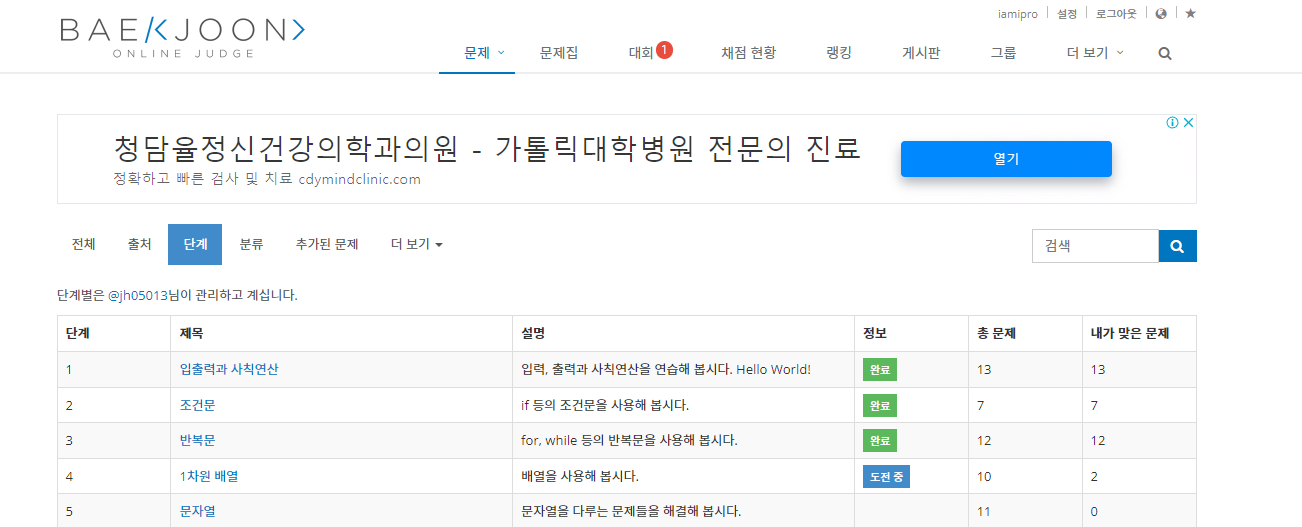 단계별은 @jh05013님이 관리하고 계십니다. 단계제목설명정보총 문제내가 맞은 문제1입출력과 사칙연산입력, 출력과 사칙연산을 연습해 봅시다. Hello World!132조건문if 등의 조건문을 사용해 봅시다