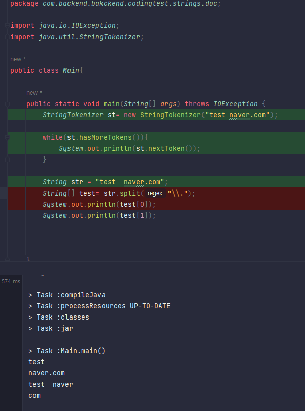 2. 두번째 차이점으로 하기를 살펴보면 StringTokenizer은 문자또는 문자열을 구분한다면, split 메소드는 정규표현식으로 구분합니다.