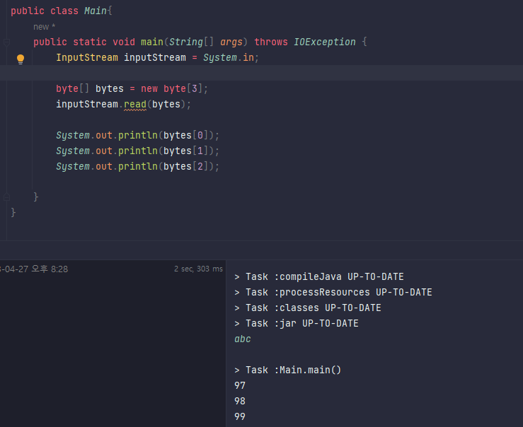 byte로 배열로 각각 받아야만 abc 3개 하나씩 출력 가능한것을 볼 수 있다.