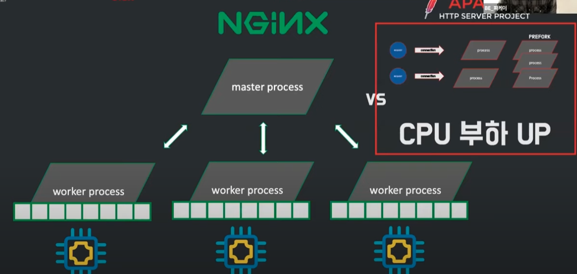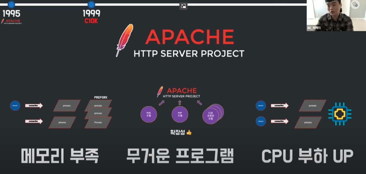 수많은 동시 커넥션을 감당하기에는 아파치서버 구조상 프로세스가 생기면 계속 만들어 메모리 부족 현상이 나타나고,