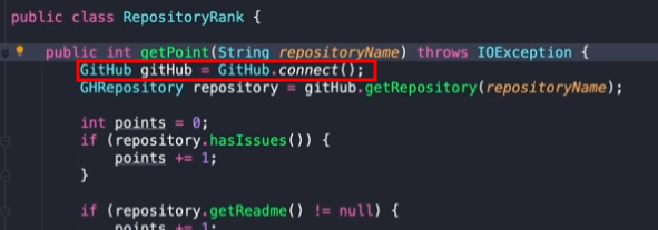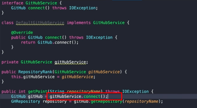 그 다음 클래스로 인터페이스스(GitHubService)를 메소드로 구현하여 GitHub.connect()를 return 하게 한다음
