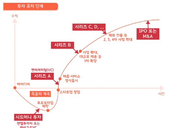 투자 유치까지 죽음의계곡을 지나 시리즈 A,B,C,D를 넘어 IPO또는 M&A가 되면 수익률이 극대화됨을 시장에서 인정받은 것이다.
