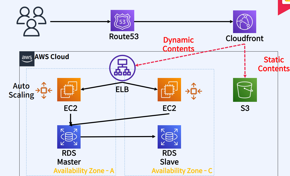 동적Contents는 ELB( 로드밸런서)로 보낸다. ELB ( 로드밸런서)는 탄력적이고 지속적으로 대응해서 EC컴퓨터를 만들어서 대응한다.