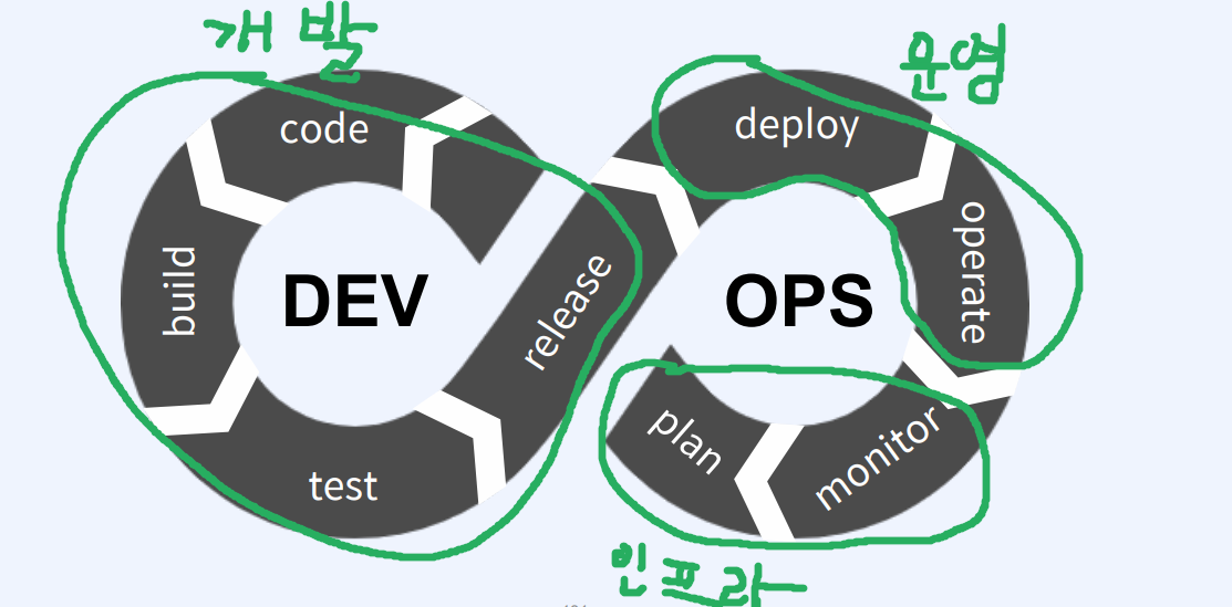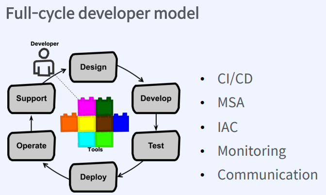 DEVOPS는 설계(Design)/개발(Develop-Test)/운영(Deploy-Operate)/인프라(Support - CI/CD , IAC ,MSA, Monitoring)를 통합한다.