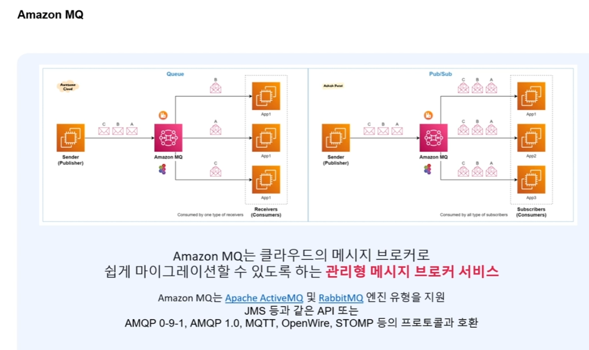 Amazon MQ - 클라우드의 메시지 브로커로 쉽게 마이그레이션할 수 있도록 하는 관리형 메시지 브로커 서비스이다.