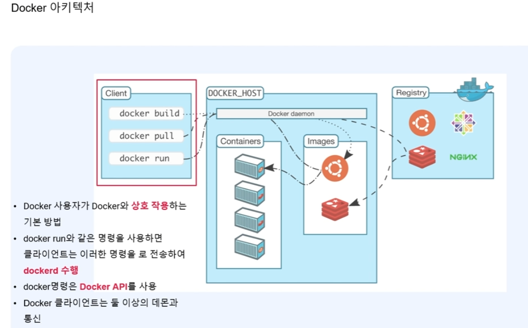 도커이미지를 실행하는 있는 Containers, 도커를 관리 실행하는 DOCKER_DAEMON, 도커 Images 가 있다.