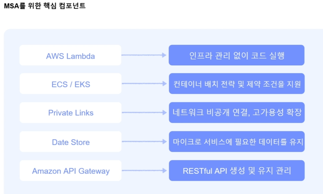 MSA 는 Lambda, ECS/EKS, Private Links ,Data Store, API Gateway 를 통해 잘 유지된다.