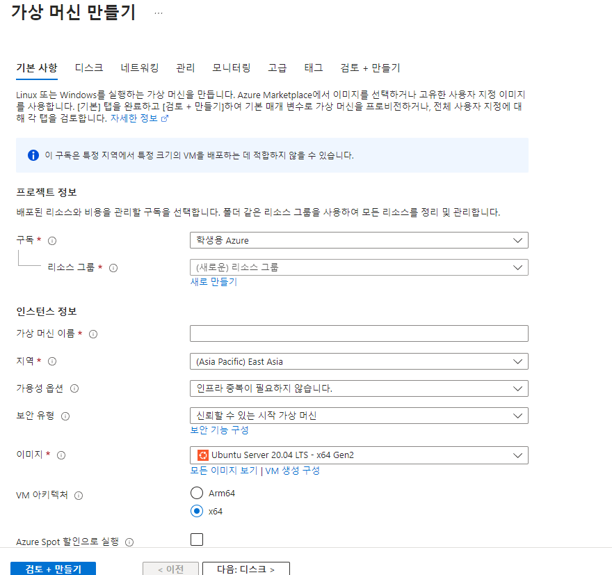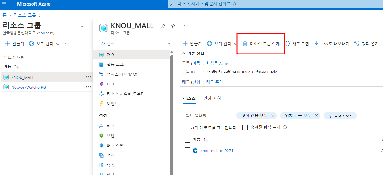 만들고 나서 리소스 그룹에서 삭제를 한다.