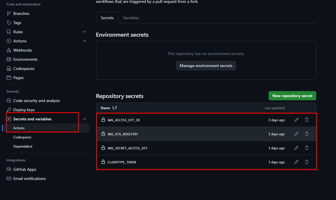 Secrets and variables - Actions에 가서