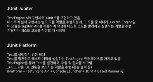 JUnit5 는 Jupiter , Platform 로 구성된다.