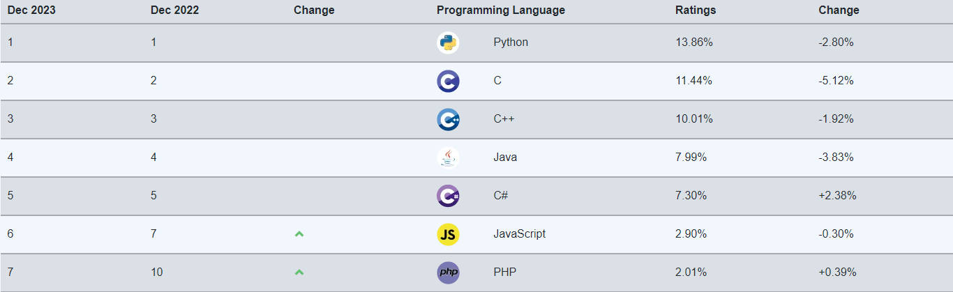참고로 2023년 12월 기준으로 TIOBE에서 집계한 프로그래밍 언어순위에 따르면