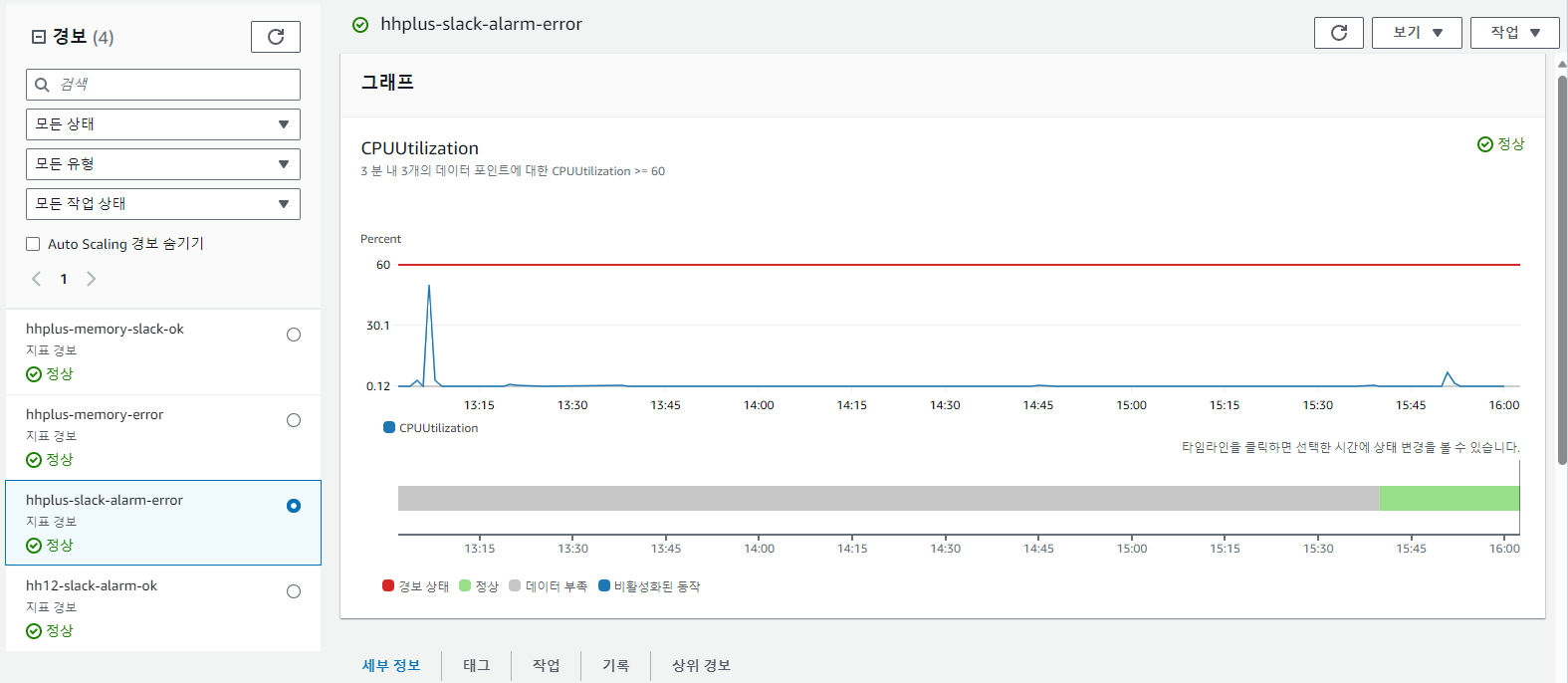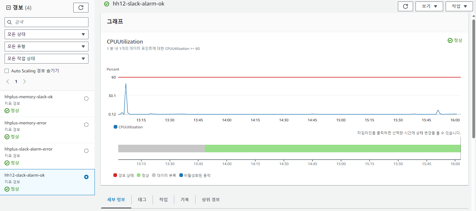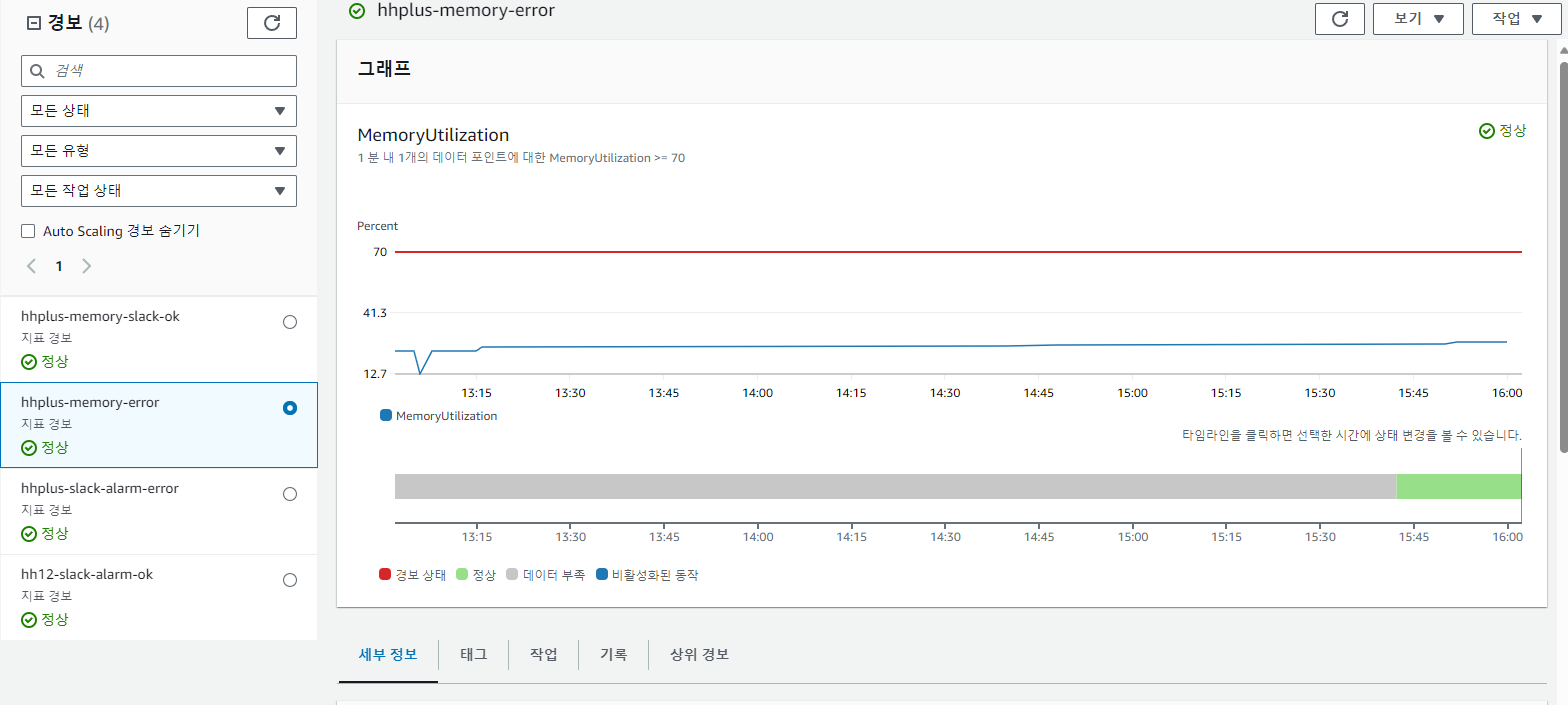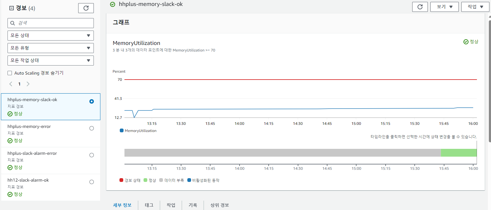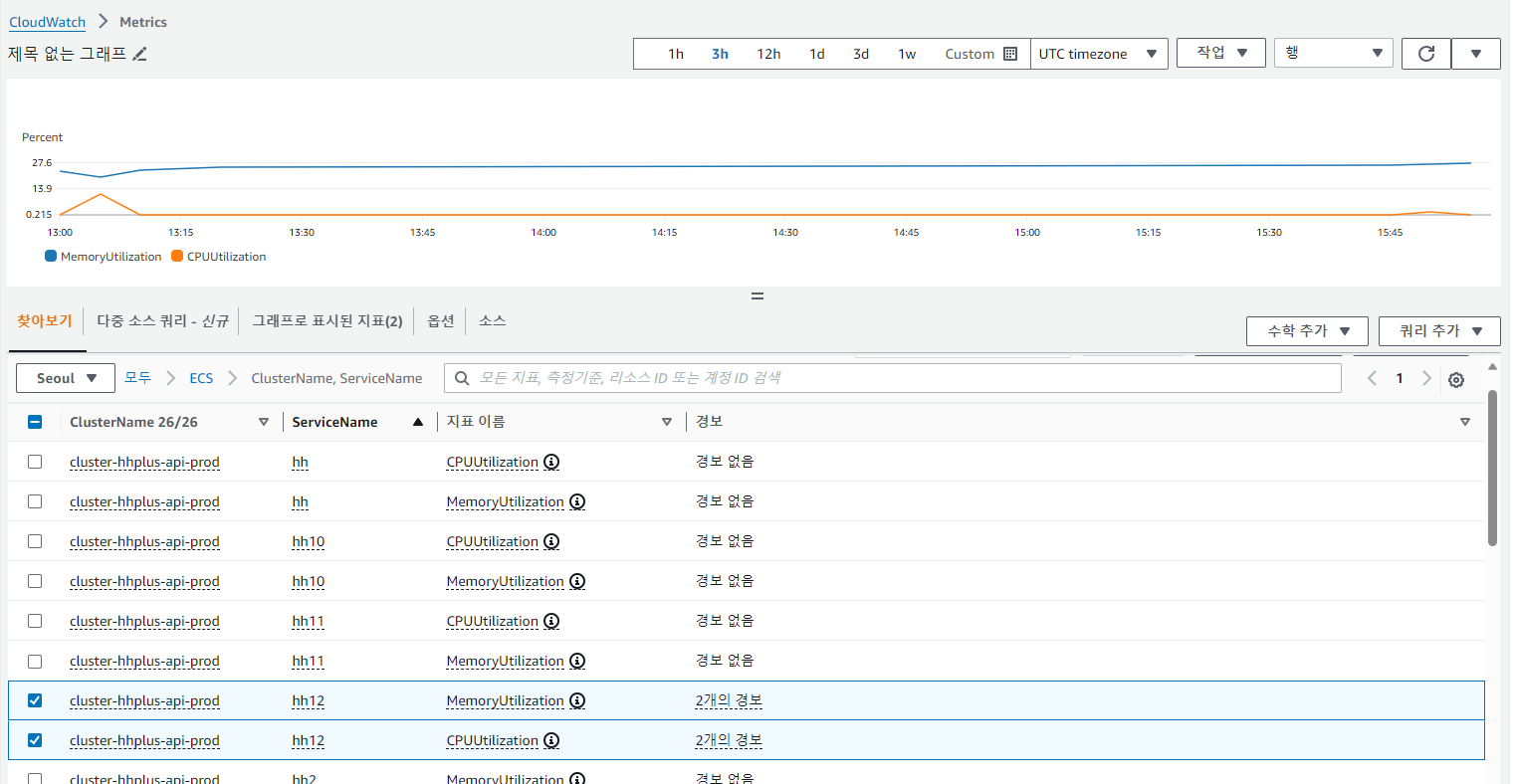 2) CloudWatch -> Alarms 생성 ( ECS의 활성화된 서비스 선택 : CPU, Memory 지표설정)
