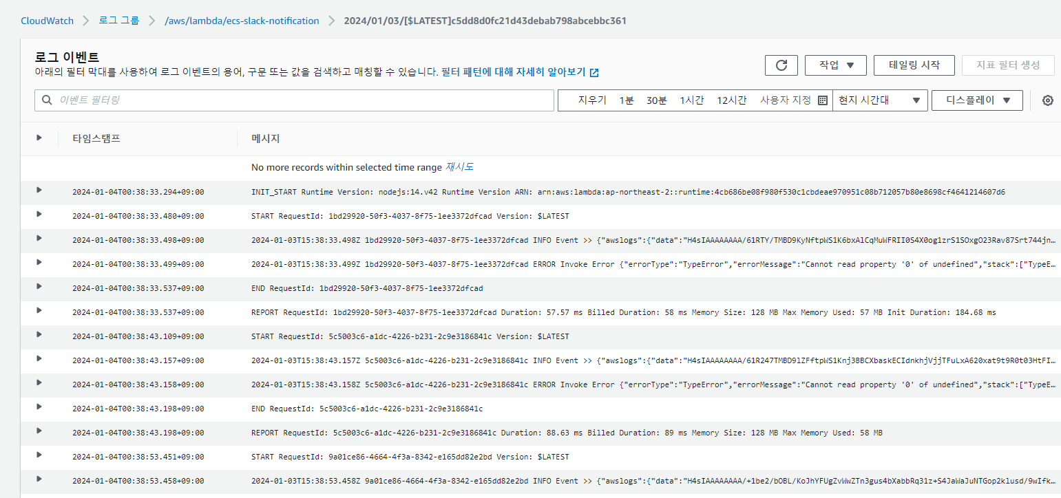 트리거 - CloudWatch Logs , Log group , Filter name, Filter pattern 생성 : [error] =>패턴에 맞는 슬랙 알람)