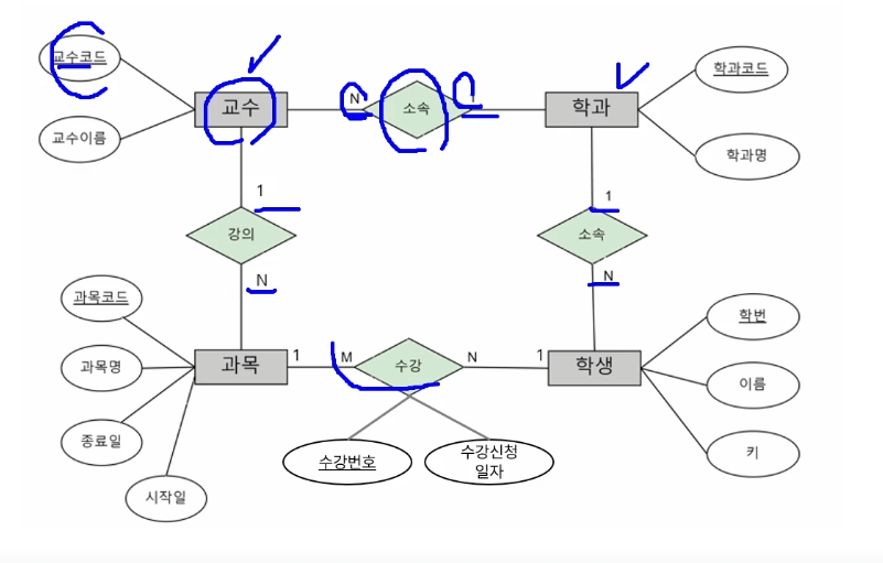 그래서 관계적인 면에서 학과에 속한 학생이 교수가 개설한 과목에