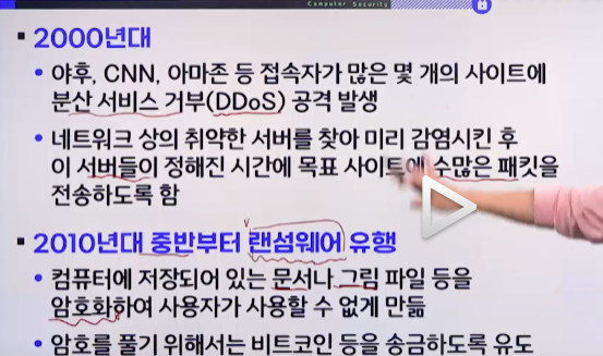 2000년대는 DDoS공격, 2010년대는 랜섬웨어가 유행했군요