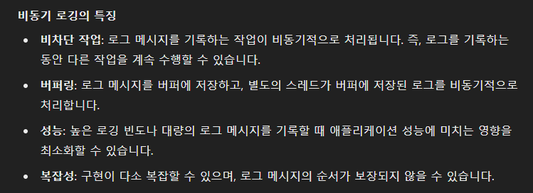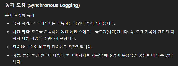 기본탑재되는 Logback은 동기로깅인데 아래와 같은 즉시처리, 차단작업, 단순성의 특징이 있고 대량 로그는 성능저하 우려가 있다.