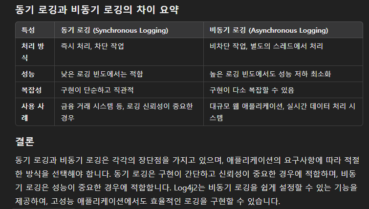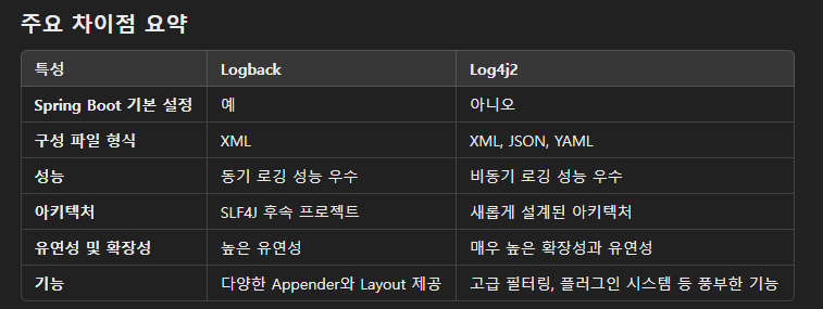 Logback은 SLF4J(Simple Logging Facade for Java)의 후속 프로젝트로 개발되어서 SLF4J와 Logback은 부트에서 기본 탑재되었고 동기성 로깅에 좋고, Log4j2는 비동기성 로깅에 좋다. 조건부 로깅, 고급 필터링, 플러그인 시스템 등 다양한 기능을 제공하고, 로그 이벤트를 큐(Queue)를 통해 비동기로 처리하여 애플리케이션 성능에 미치는 영향을 최소화한다.