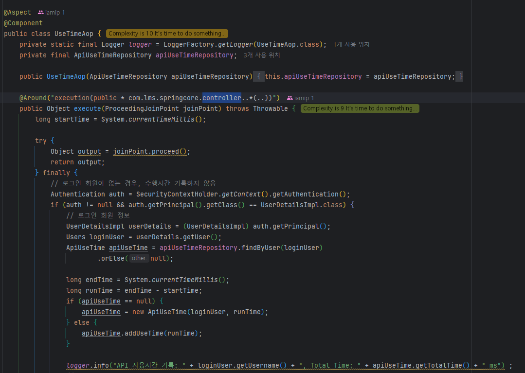그리고 AOP라는 관점지향프로그래밍으로 반복작업을 단순화 할 수 있다 예를 들어 로깅이나 API사용 횟수를 측정한다면,