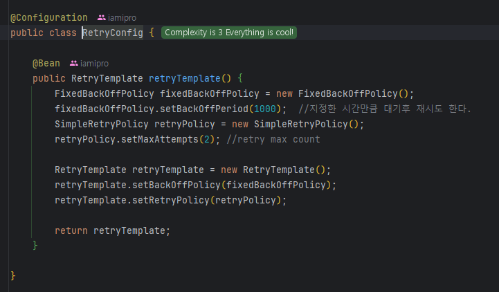 RetryConfig는 CircuitBreaker의 반열림 정도의 장애 대응과 비슷하다. API요청이나 작동이 안되면, 최대 시도횟수를 설정하고 안될시에 닫았다고 지속적으로 재시도한다.