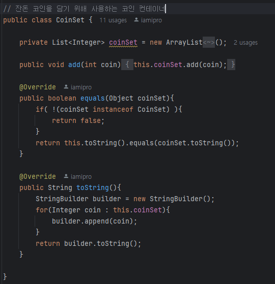 세번째로는 잔돈 코인을 반환하기 위해 사용하는 CoinSet