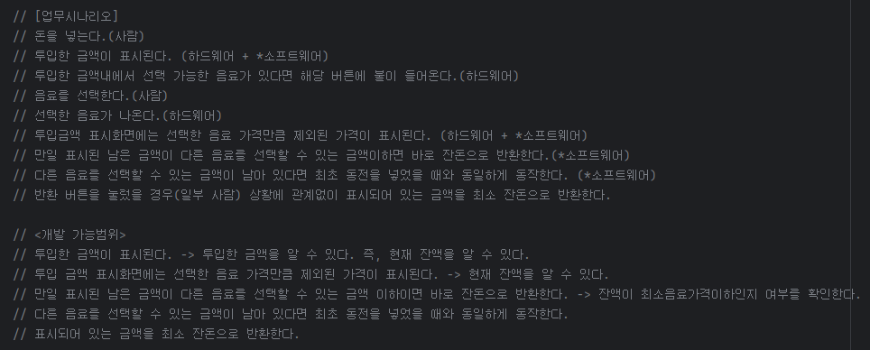 TDD를 하기전에 업무시나리오를 그려보면, 여기서 사람과 하드웨어와 소프트웨어의 역할 별로 파악하면서 개발 가능 범위를 알 수 있다.