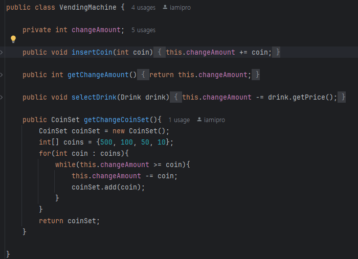 두번째로는 코인을 넣었을때 잔액확인을 할 수 있는 VendingMachine클래스