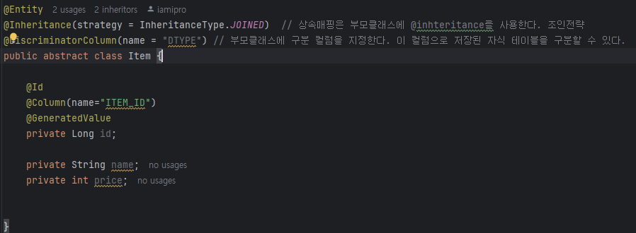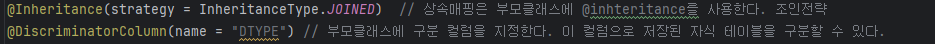 상속매핑은 부모클래스에 @inhteritance를 사용한다. 조인전략