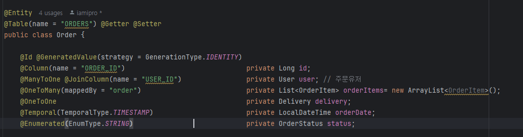 주문도 다대일과 일대다의 관계를 잘표현했다. OrderItem과 User 에서 나타난다.