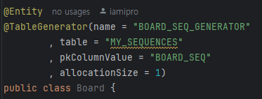 시퀀스 전략을 테이블에 만든 경우 PK컬럼에 generator로 시퀀스를 지정해줘야 한다.