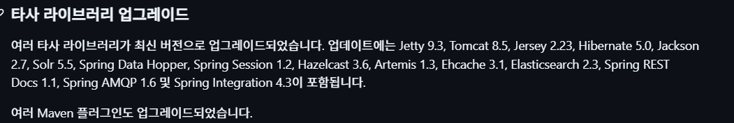 하이버네이트5.0이상 , 서버헤더( 속성이 설정되지 않은면 응답헤더는 설정안됨) , 스프링4.3이상 , JUnit4.12이상(AssertJ라이브러리제공), 탐캣8.5 지원, Redis를 SpringData저장소를 백업하는데 사용가능, RestTemplate 빌더지원