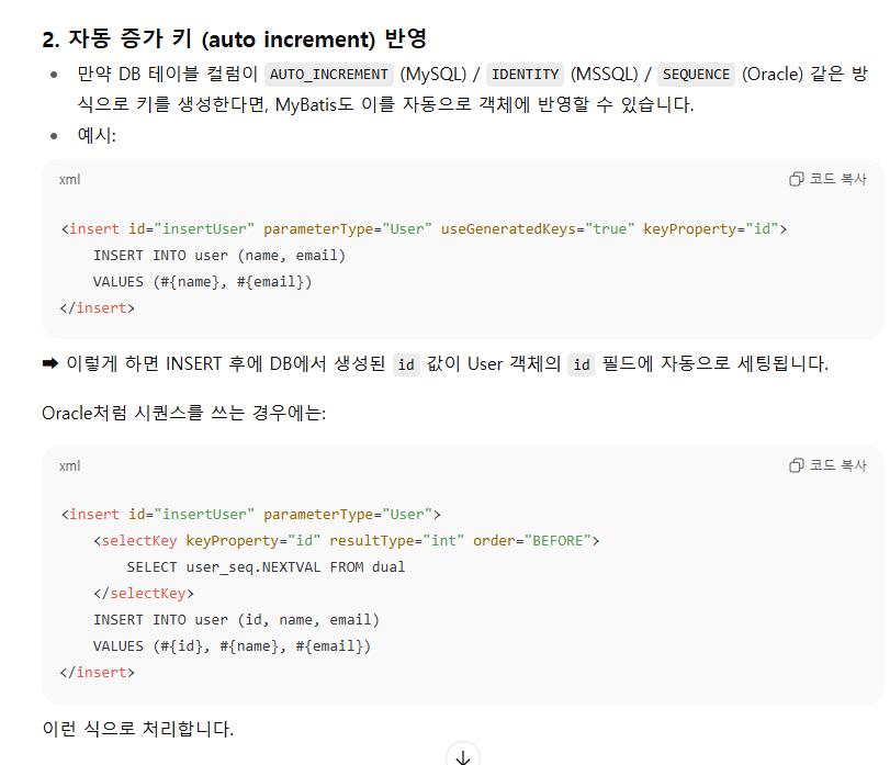 - resultMap: 컬럼명 ≠ 필드명이면 수동 매핑 필요.